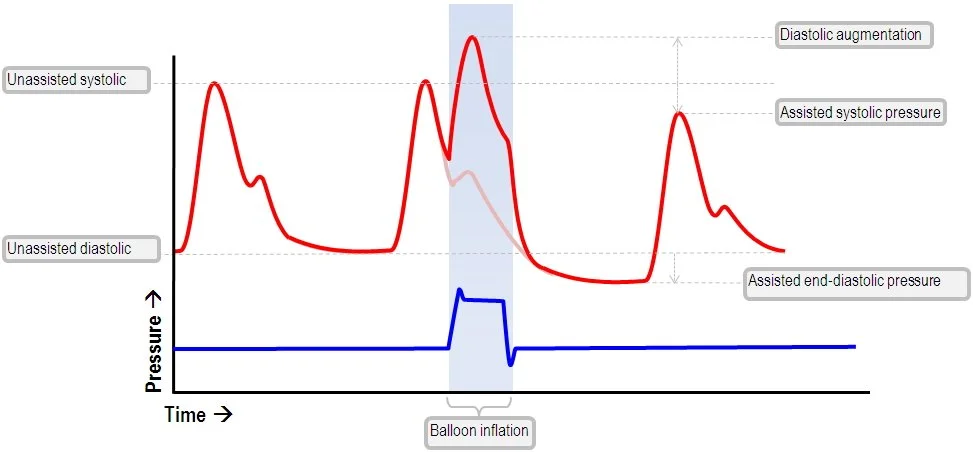 The increase in early diastolic pressure by the balloon is referred to as diastolic augmentation. Diastole begins with the closure of the aortic valve, which creates to dicrotic notch on the arterial wave. The dicrotic notch is the best marker for timing balloon inflation. Balloon inflation must occur prior to the next systole. Deflated during systole. Deflation is said to occur at the end of diastole during the period of isovolumetric contraction when all the cardiac valves are closed.
