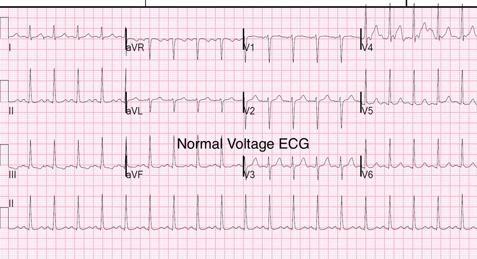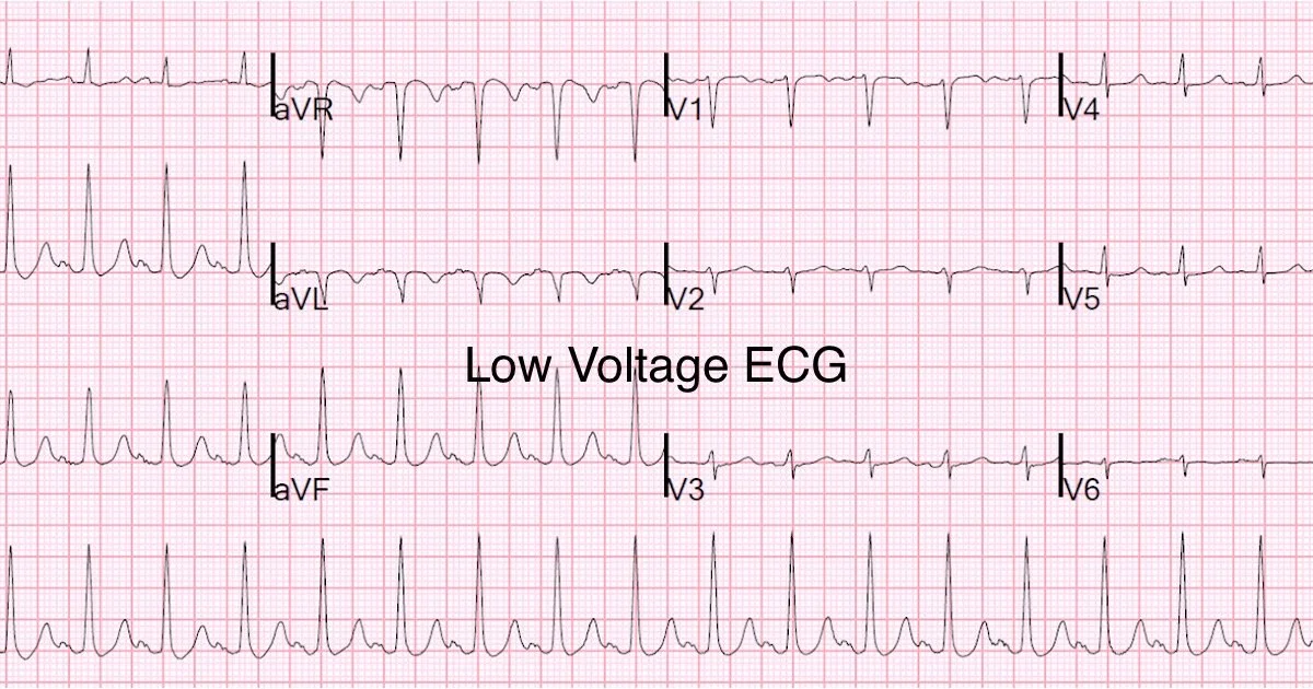 A “low voltage,” ECG is a sign that something is getting in the way of the electrical conduction of the heart and the EKG leads on the patient’s chest.